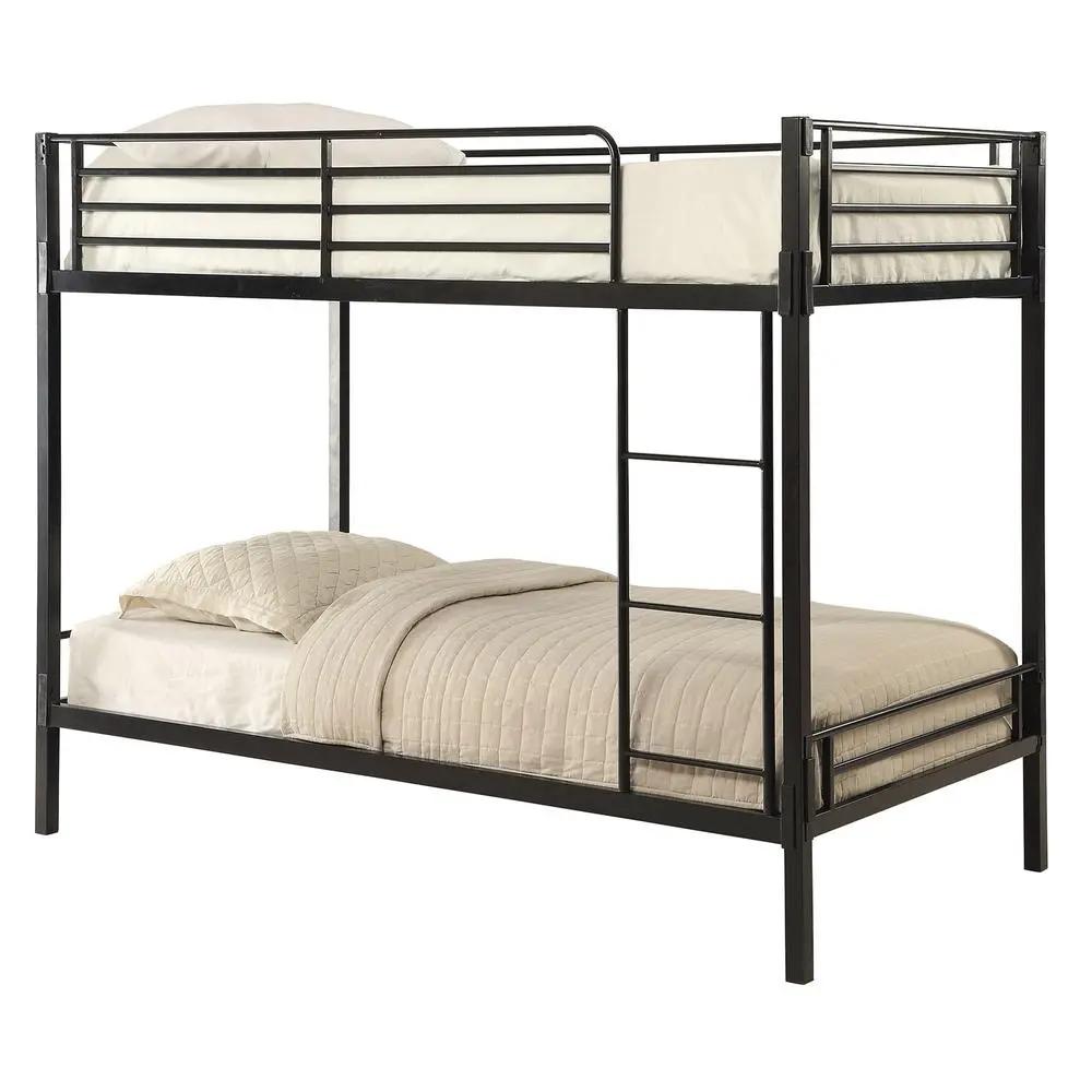 Requires no tools for assembly Metal bed slats lock in for additional strength Finished in a rich black powder coated finish Twin over Twin bed